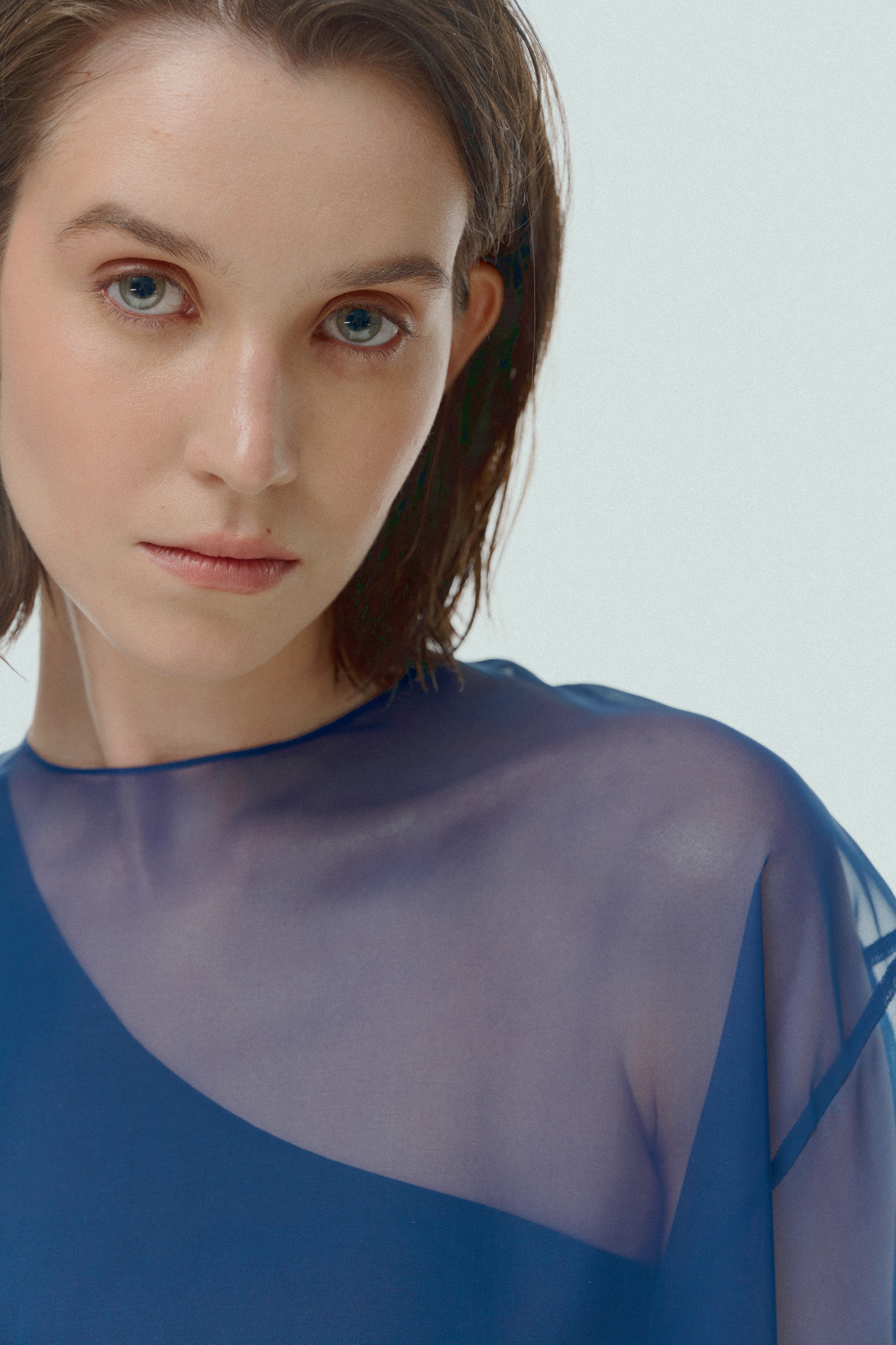 Лёгкая полупрозрачная футболка Коллекции I выполнена из средиземноморской органзы морского синего оттенка и сочетает в себе эксклюзивный дизайн и арт-эстетику.
