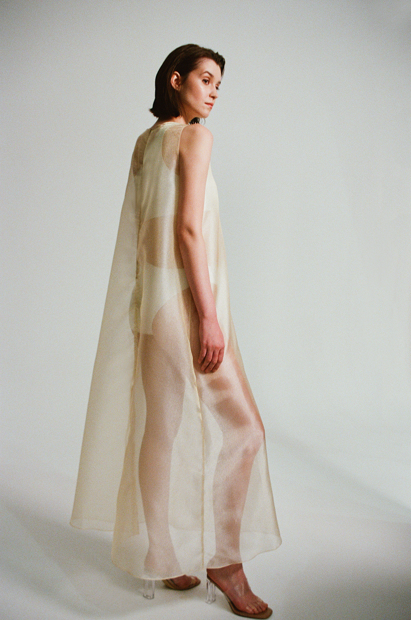 Легкий полупрозрачный сарафан макси длины Коллекции I из средиземноморской органзы золотистого оттенка бежевого цвета.