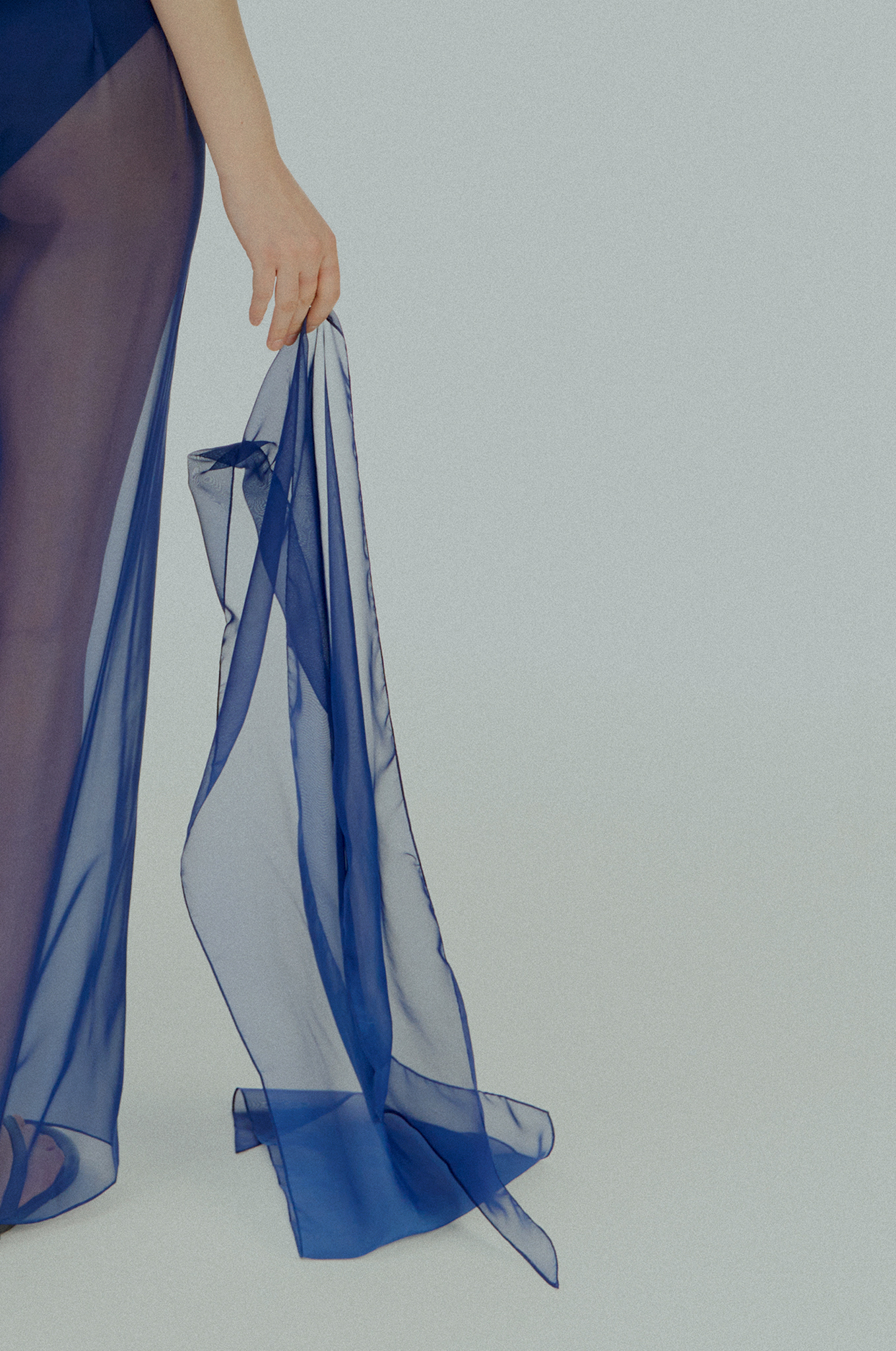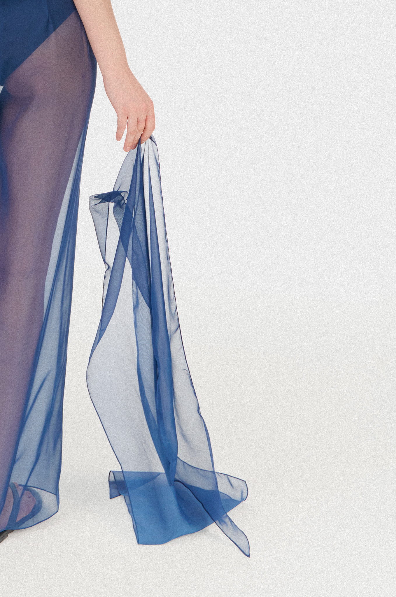 Лёгкий прозрачный шарф Коллекции I выполнен из органзы глубокого синего оттенка и представляет собой эксклюзивный арт-аксессуар с уникальным дизайном и премиальной отделкой.