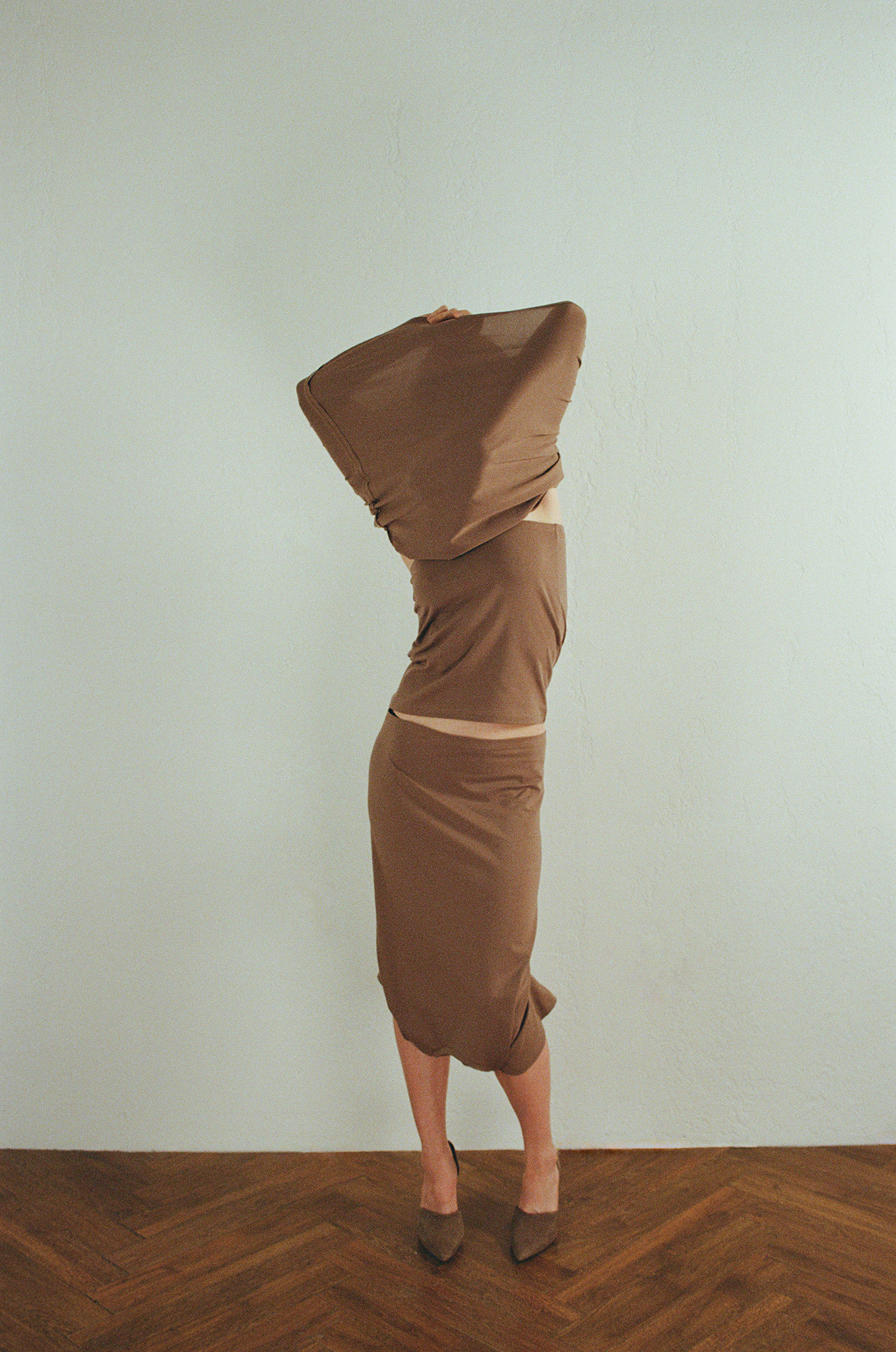 Без давления — только форма, подчинённая телу. Выверенный крой позволяет носить юбку с логотипом спереди или сзади.